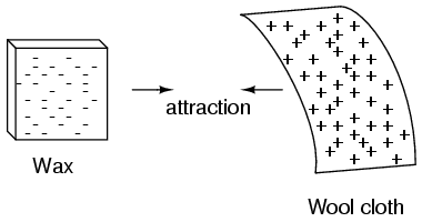 If we take the examples of wax and wool which have been rubbed together, we find that the surplus of electrons in the wax (negative charge) and the deficit of electrons in the wool (positive charge) creates an imbalance of charge between them. This imbalance manifests itself as an attractive force between the two objects: